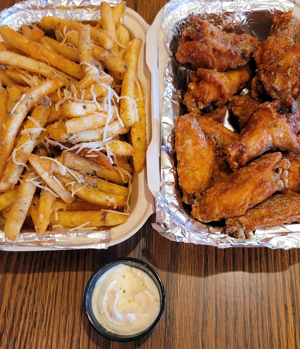Parmesan Garlic Truffle Fries with Garlic Mayo Dip & Truffle Dry Rub on the Chicken Wings